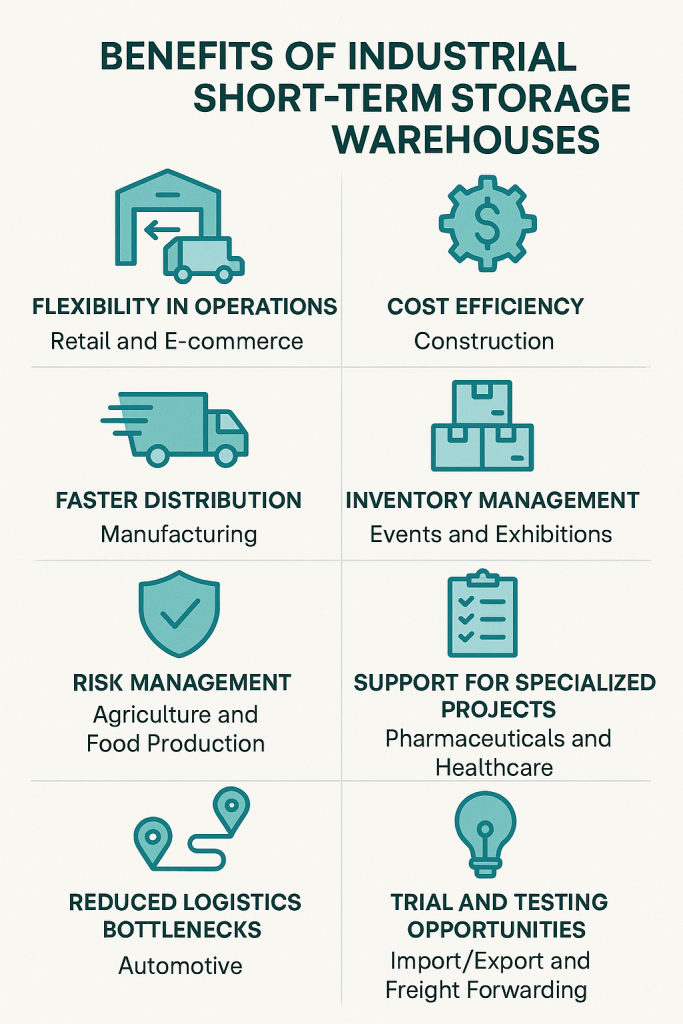 Industrial short-term storage warehouses provide businesses with flexible, cost-effective, and scalable storage solutions to manage fluctuating operational needs, project-specific demands, and market uncertainties. These warehouses are vital for optimizing logistics and responding quickly to supply chain shifts.